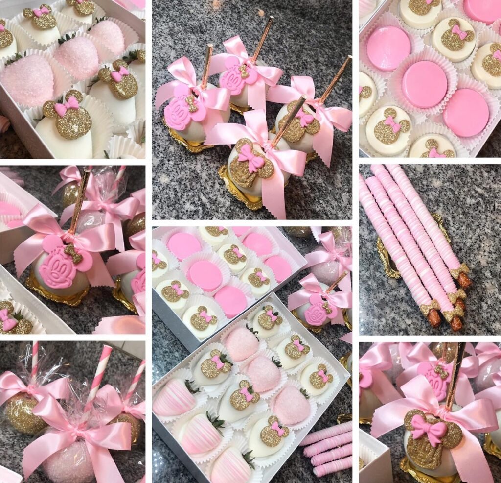 This dessert collection is a total showstopper for a girl’s baby shower or birthday. From chocolate-covered apples wrapped in shiny bows to dipped Oreos topped with glittery Minnie heads, every treat ties perfectly into the pink-and-gold theme. You’ll also find chocolate-dipped strawberries, pretzel sticks, and marshmallows, all dressed up in matching shades of blush and sparkle. What makes this set special is how coordinated it looks—every piece feels like part of a bigger picture. Guests won’t just snack, they’ll take photos first, because it’s too pretty not to.