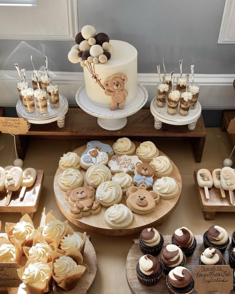 This setup has the sweetest cozy vibe, perfect for a neutral or rustic-themed baby shower. The centerpiece cake features a teddy holding a bunch of chocolate balloons, surrounded by a spread of matching treats. You’ll find bear-shaped cookies, meringue swirls, layered dessert cups, cupcakes in cupcake liners, and even teddy-topped cakesicles. The mix of creams, browns, and soft neutrals ties everything together beautifully without being over the top. What makes this table so inviting is the balance—elegant details with a playful theme that still feels warm and welcoming.