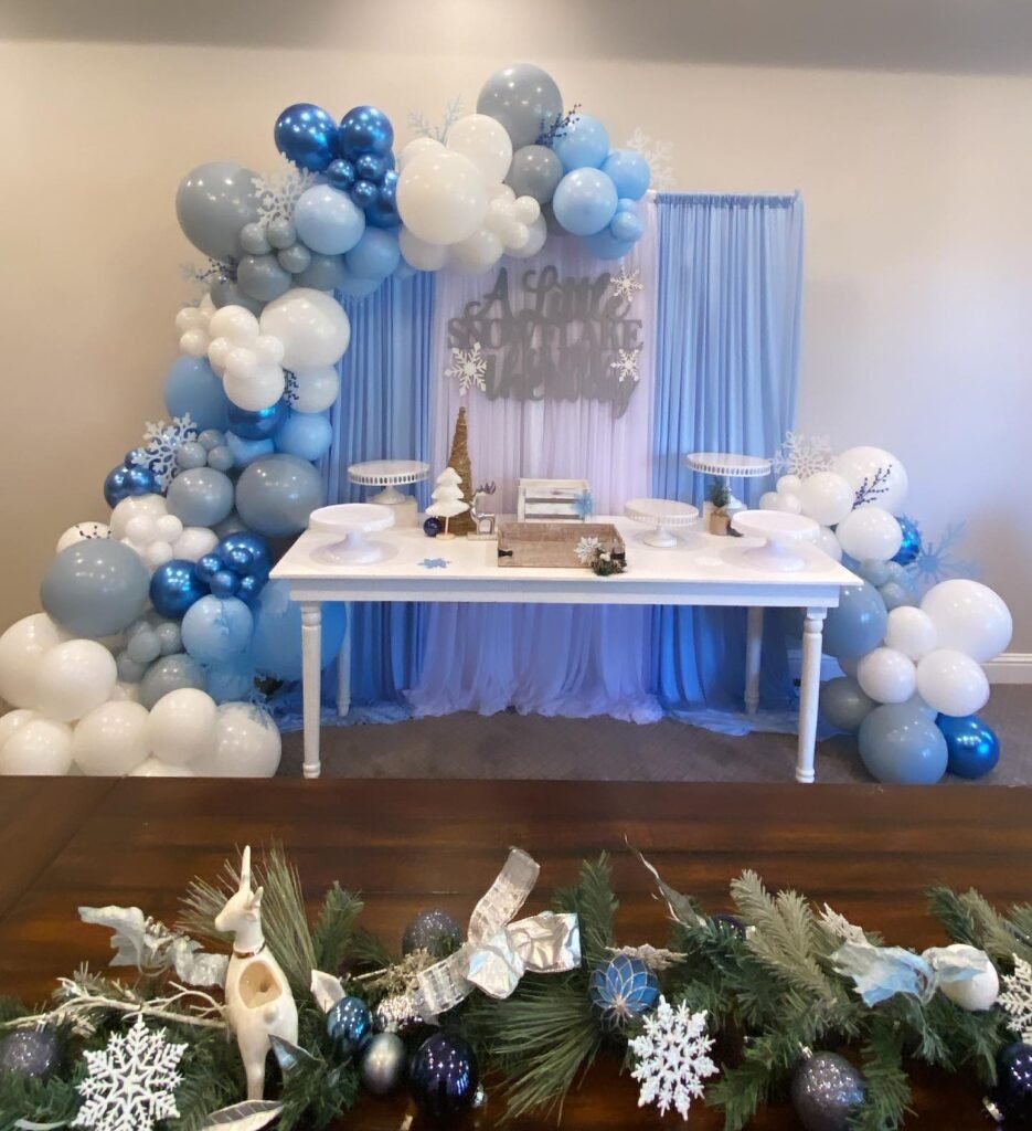 This setup is perfect for a winter baby shower, giving the whole room a frosty, magical feel. The backdrop mixes soft blue and white drapes with a balloon arch in shimmering shades of blue, silver, and white, topped off with snowflake accents. The dessert table is simple and clean, with white stands ready to hold cakes, cupcakes, and sweet treats that match the snowy vibe. Even the greenery on the front table is decorated with silver ribbons, ornaments, and more snowflakes to tie the look together. It feels cozy, elegant, and seasonal—the kind of theme that makes guests instantly smile the moment they walk in.