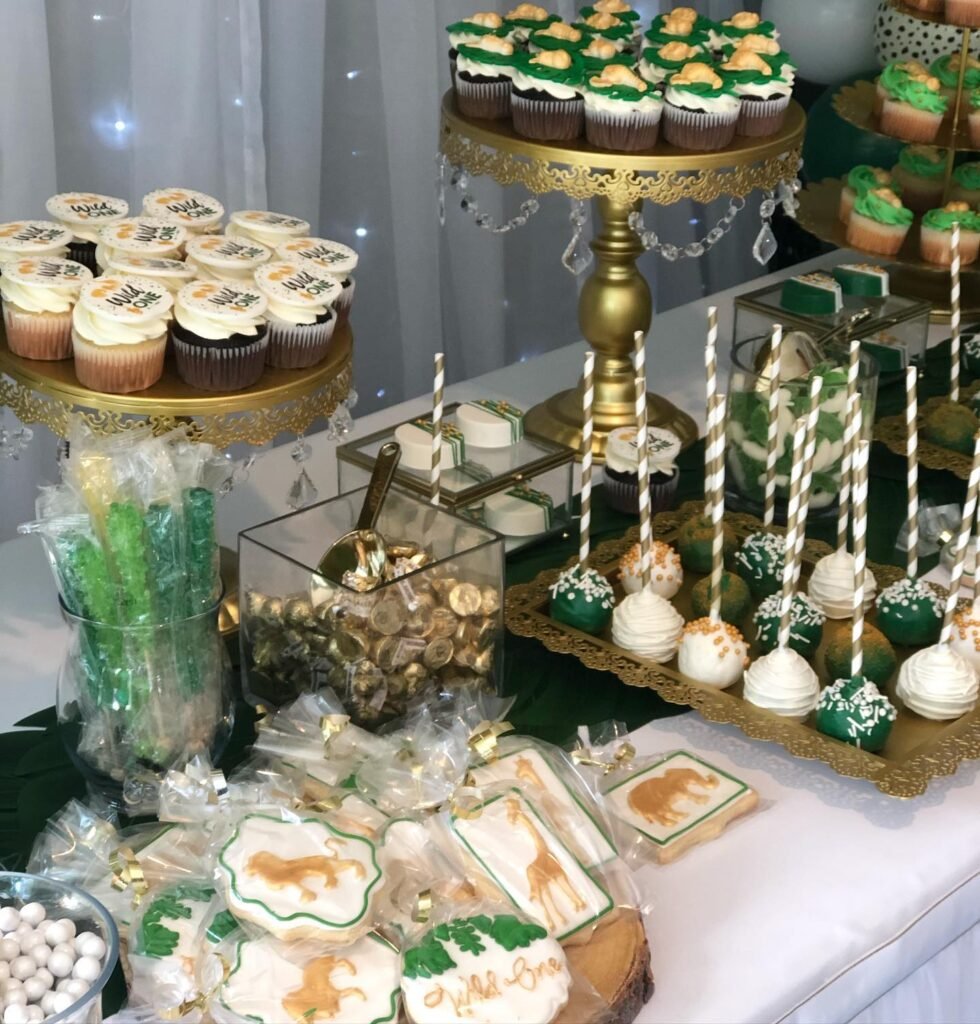 This dessert spread brings the jungle straight to the party with its rich greens, gold accents, and animal-inspired treats. The cupcakes are topped with leafy frosting and little golden lions, while the cookies showcase giraffes, elephants, and safari greenery. Gold cake pops and rock candy sticks add sparkle, and the Ferrero Rocher chocolates tie in perfectly with the theme’s luxe vibe. The mix of playful safari animals and elegant gold details makes it work for both casual and fancy baby showers.
