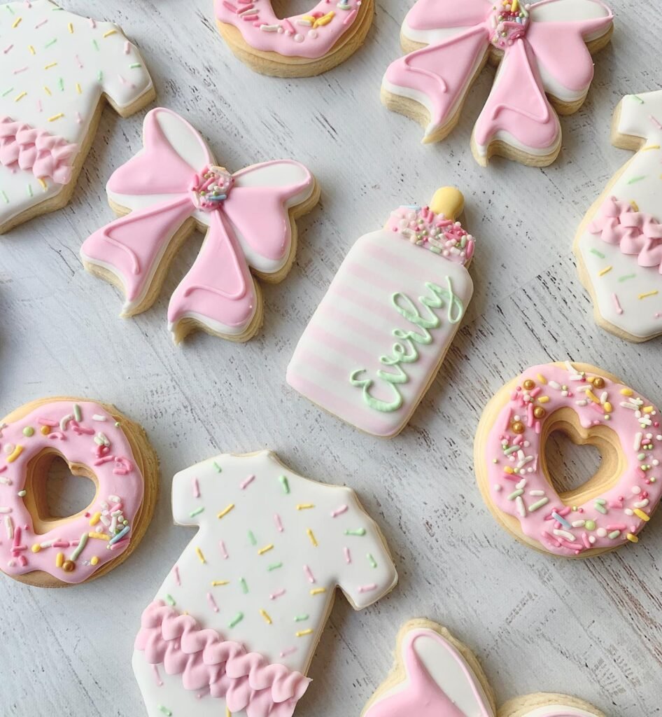 These decorated sugar cookies are almost too cute to eat. Shaped like baby onesies, bottles, bows, and donuts, they’re covered in pastel icing and finished with colorful sprinkles. The details are so sweet—the ruffles on the onesie, the little donut heart cutouts, and the personalized baby bottle with a name written on it. Perfect for a baby shower dessert table or packaged as favors, they bring a playful touch while still looking elegant.