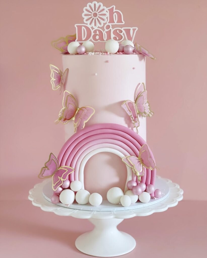This dreamy pink cake is almost too pretty to eat. Decorated with soft fondant rainbows, golden butterflies, and candy-like pearls, it feels whimsical yet elegant—perfect for a baby shower centerpiece. The tall design gives it that “wow” factor as soon as it’s placed on the dessert table. Guests will love the delicate details, from the fluttering butterflies to the pastel rainbow arch. It’s one of those cakes that doubles as décor, tying the whole theme together. Whether you slice it up or just admire it for a while, this cake makes the celebration feel magical and extra memorable.