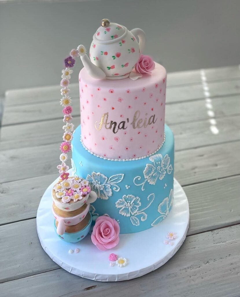 This charming two-tier cake is perfect for a baby shower with a tea party or garden theme. The top tier in pink is decorated with dainty blossoms and topped with a teapot pouring flowers into stacked teacups, while the blue bottom tier features elegant white floral designs. The sugar roses and tiny details make it feel whimsical yet sophisticated. Guests will be wowed by the playful design before they even get a slice. It’s the kind of cake that doubles as the centerpiece, tying the whole theme together. Sweet, delicate, and memorable—this dessert makes your celebration feel extra special.
