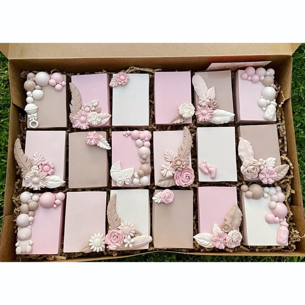 These pastel chocolate bars are perfect for gifting guests or adding to a dessert table at a baby shower. Each bar is decorated with delicate fondant details—tiny roses, feathers, baby feet, and even miniature prams—making them look more like art than candy. The soft shades of pink, beige, and white keep the style elegant and sweet, while the floral accents tie beautifully into any baby shower theme. Guests will love the personal touch, whether they enjoy the chocolate right away or take it home as a keepsake. Pretty, thoughtful, and easy to share, these bars are as charming as they are delicious.