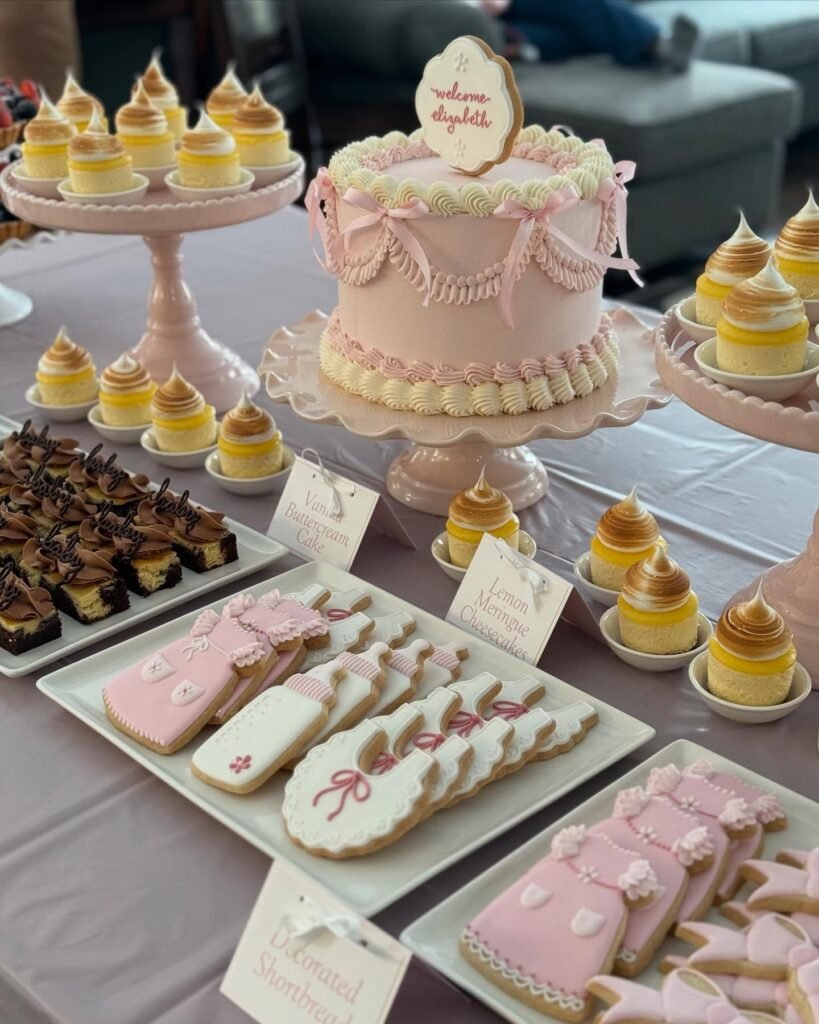 This spread is the definition of sweet and classic. The centerpiece is a soft pink buttercream cake, trimmed with piped pearls and bows, topped with a personalized cookie that makes it extra special. Around it, you’ll find lemon meringue cheesecakes with golden peaks, chocolate brownies layered with rich frosting, and decorated shortbread cookies shaped like baby bottles, bibs, and dresses. The matching pastel stands and trays pull the whole table together, making it look polished without being fussy. Perfect for a baby girl shower, this setup mixes elegance with just the right amount of playfulness—and every treat looks as good as it tastes.