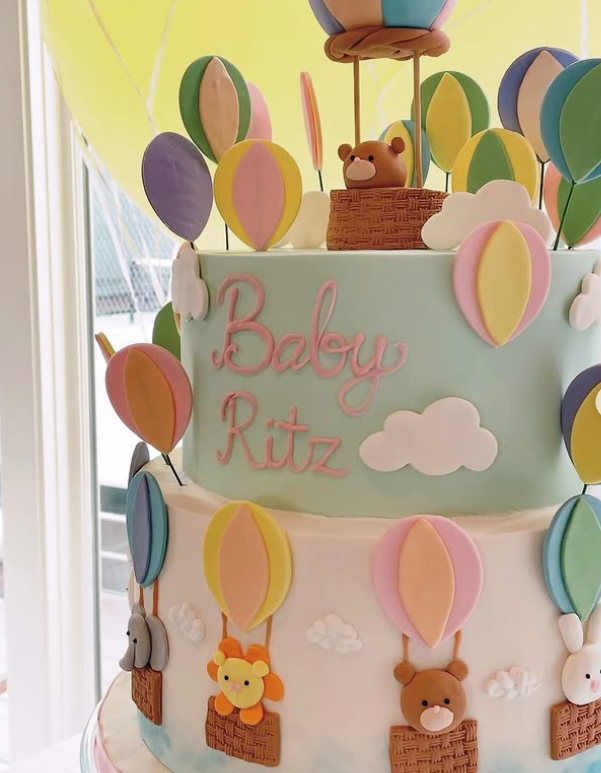 This hot air balloon cake is pure joy in dessert form. The tiers are covered in pastel skies with fluffy clouds, colorful balloons, and little animals peeking out of baskets. At the very top, a teddy rides in a balloon, making it the perfect centerpiece for a baby shower. The mix of soft colors and playful details makes the whole cake feel light and cheerful—almost like it’s floating. Guests will love how whimsical it looks, and it ties beautifully into travel, adventure, or “the sky’s the limit” themes. A cake like this doesn’t just taste good—it tells a story worth celebrating.