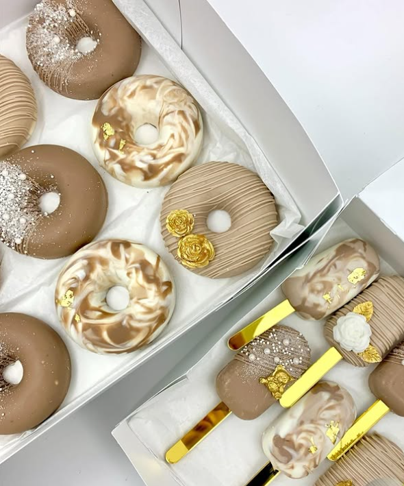 These desserts look like little works of art. The donuts are dressed in shades of mocha and cream, some swirled with a marble effect, others topped with edible gold and tiny flowers. Alongside them, cakesicles on golden sticks add the same luxe vibe with textured chocolate, pearls, and floral accents. They’re the kind of treats that feel modern and elegant at the same time—perfect for a gender-neutral shower, bridal party, or any classy celebration. What makes them special is the balance: simple shapes elevated with gorgeous detailing.