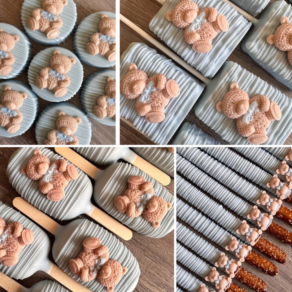 This dessert set is almost too cute to eat. Each piece is coated in light blue chocolate with little teddy bear toppers sitting on top—some on Oreos, some on cakesicles, and even on chocolate-dipped pretzels. The mix of shapes keeps the table fun and varied, while the matching design ties it all together. They’re perfect for a baby boy shower, especially if you want bite-sized treats that guests can just grab and enjoy. The soft pastel look adds a sweet, cozy vibe, and honestly, they double as decoration before anyone digs in. A simple but charming way to dress up your dessert table.