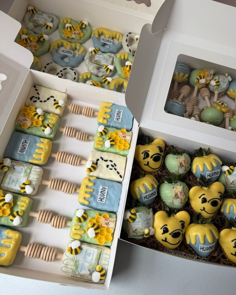 This themed set is buzzing with charm and sweetness. Each treat ties back to Pooh Bear’s love for “Hunny”—from cakesicles dripping in golden honey to chocolate-dipped strawberries decorated with buzzing bees and honeycomb details. There are even pretzels and bear-shaped sweets that look almost too playful to eat. The mix of soft blues, yellows, and greens makes the whole set feel fresh and cheerful, while the little honey dipper sticks add that perfect finishing touch. Perfect for a baby shower, birthday, or “what will it bee?” reveal, this dessert box brings nostalgia and whimsy to the table in the tastiest way.