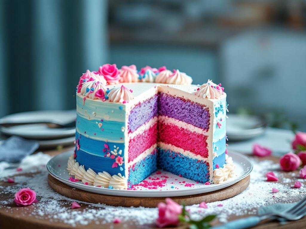 A cake reveal is a fun and tasty way to share the big news about your baby’s gender. Imagine cutting into a beautifully decorated cake and discovering vibrant colors inside! This cake, with its layers of blue, pink, and purple, is a perfect example of how to create excitement during your celebration.