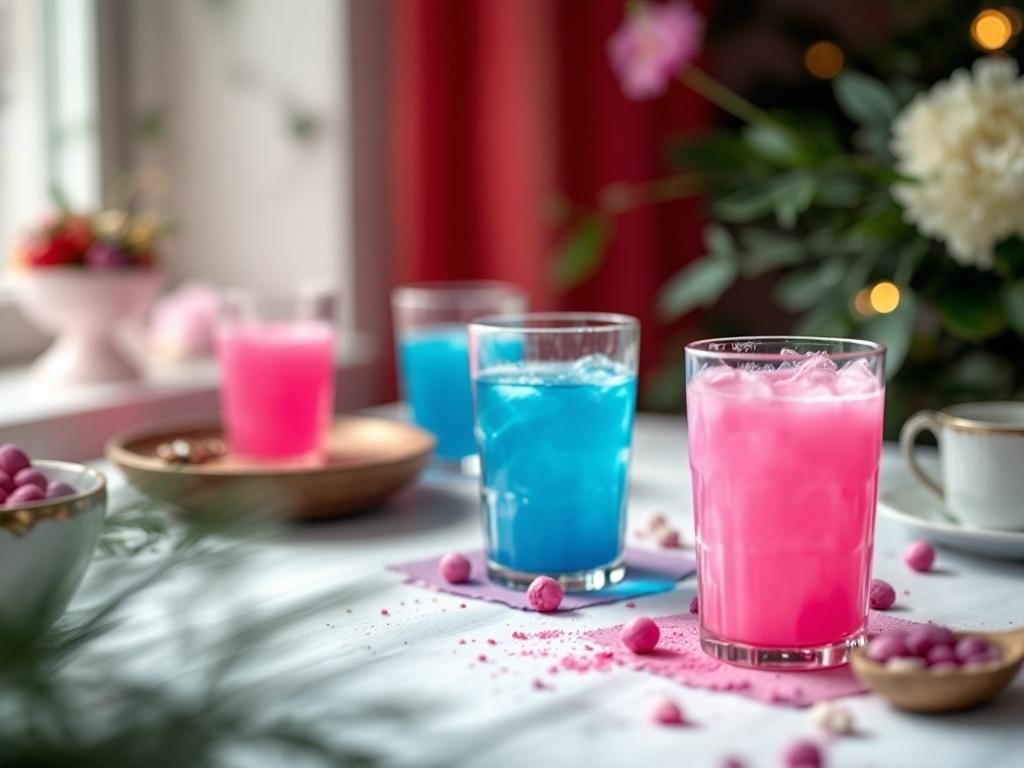 When it comes to gender reveal parties, drinks can add a fun twist to the celebration. The image shows vibrant pink and blue beverages, perfect for revealing whether it’s a boy or a girl. These colorful drinks not only look great but also set the mood for the party.